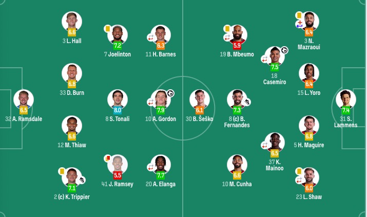 纽卡首发:32-拉姆斯代尔、2-特里皮尔、3-刘易斯·霍尔、12-佳夫、33-丹-伯恩、7-乔林顿、8-托纳利(97'4-博特曼)、41-雅各布·拉姆塞、10-戈登(85'23-雅各布·墨菲)、11-巴恩斯(46'28-威洛克)、20-伊兰加(85'18-奥苏拉)